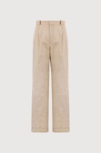 Damskie spodnie w kolorze piaskowym wykonane z wiskozy i lnu. Wyróżnia je: